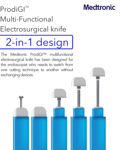 ProdiGI™ multifunctional electrosurgical knife has been designed for the endoscopist who needs to switch from one cutting technique to another without exchanging devices.