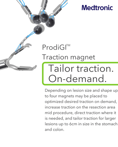 ProdiGI™ traction magnet may be placed to tailor traction for larger lesions up to 6cm in size in the stomach and colon; depending on lesion size and shape up to four magnets may be placed.